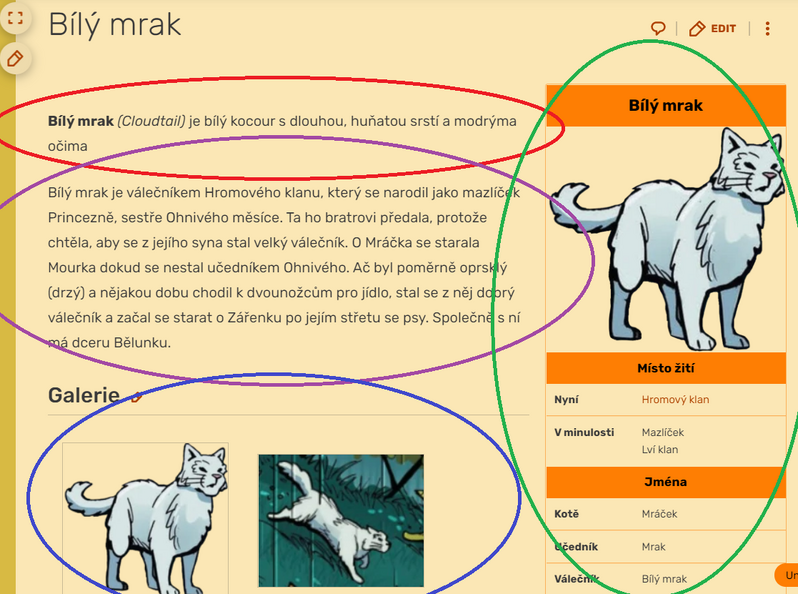 Hlavní věcí u postavy je, aby měla napsané jméno (červeně), popis (taky červeně), celkový souhrn jejího příběhu (fialově) a infobox (zeleně). Pokud máme více obrázku dané postavy, můžeme udělat i galerii (modře).