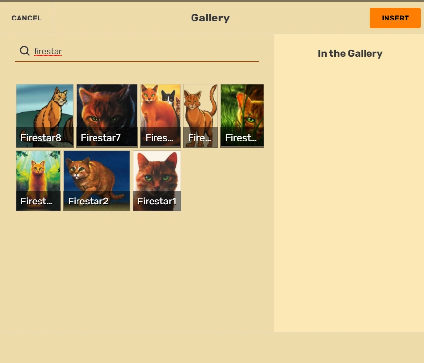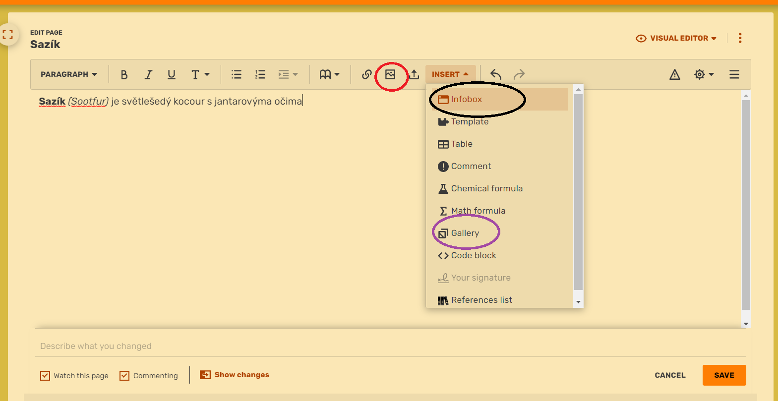 Na liště naleznete vložení obrázku (červeně) a po najedí "INSERT" můžete zvolit infobox (černě) či galerii (fialově). Infoboxy vybírejte pouze ty, které mají v názvu "aktuální", ostatní se již nepoužívají.