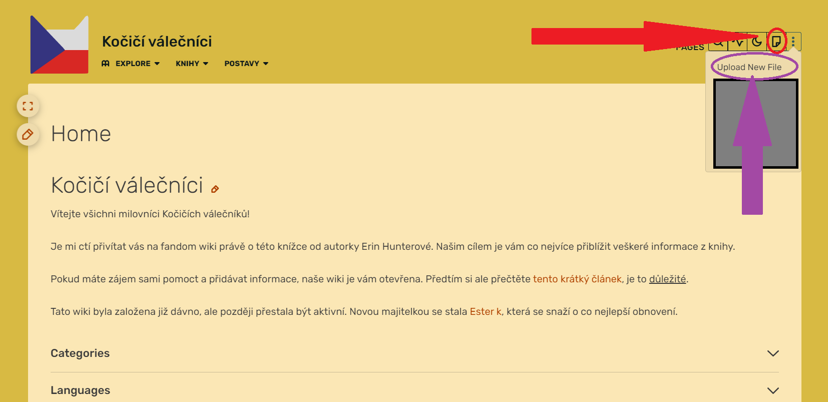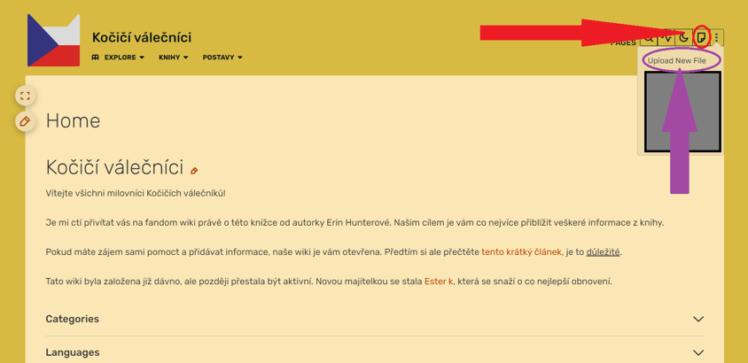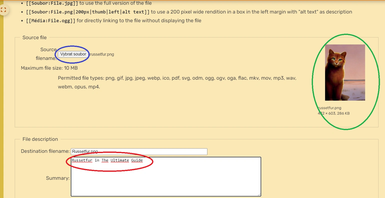 Následně kliknete na "upload file" (modře zvýrazněno), vyberete obrázek ze svého počítače a tím ho nahrajete, zobrazí se (zeleně zvýrazněno). Jméno souboru by mělo být krátké a pokud se jedná o postavu, tak její anglické jméno v nejvyšší pozici (například obrázek Zrzka jsem nahrála jako Firestar, takže ho všichni dokážeme nalézt). Pokud je více postav/obrázku se stejným jménem, očíslujte (např. Firestar1, Firestar2, Firestar3...). Také se vám ukáže, pokud je obrázek s tímto jménem na wiki již nahraný. K tomu přidáme popis, kde jsme obrázek našli (web či vlastní foto/výtvor) či odkud pochází (z jaké knihy). Poslední zmiňované lze okopírovat z anglické wiki (červeně zvýrazněno).