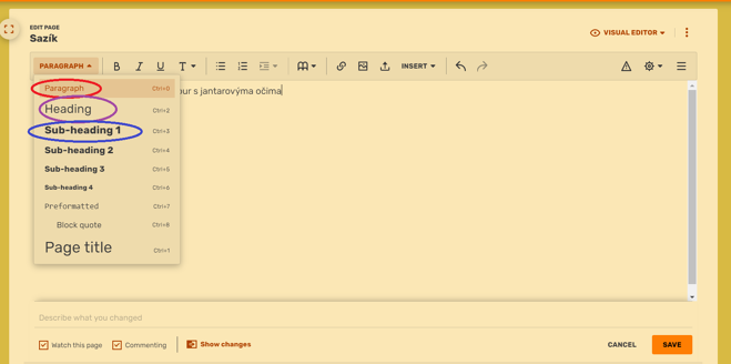 Rozlišujeme jednotlivé nadpisy. Fialový je pro nadpis, modrý je pro podnadpis a červený pro obyčejný text. Ostatní se tolik nevyužívají.