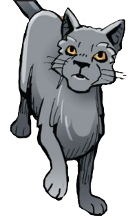 Sazík (Sootfur) je světle šedý kocour s jantarovýma očima.